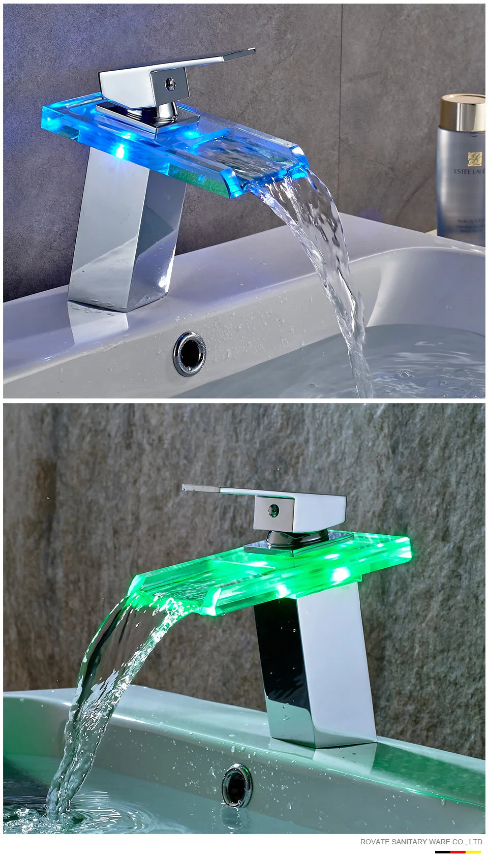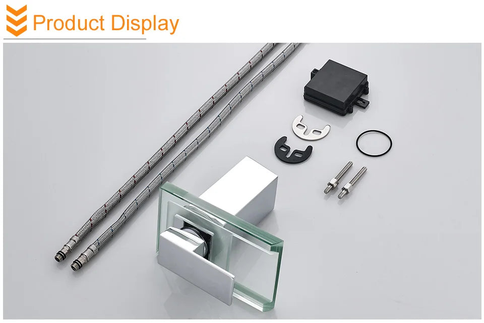 The ShowerEase LED Waterfall Bathroom Faucet is a sleek and modern addition to any bathroom. Featuring a top-mounted handle, a water outlet shelf with integrated LED lighting, and a square base, this faucet combines style and functionality. Made from durable brass with a ceramic valve core, it ensures smooth operation and long-lasting performance. The LED light changes color based on water temperature: blue for cold water (<34°C), green for warm water (34-54°C), and red for hot water (>54°C), adding both elegance and safety to your sink area. Perfect for contemporary bathrooms, this faucet is deck-mounted and compatible with single-hole installations.
