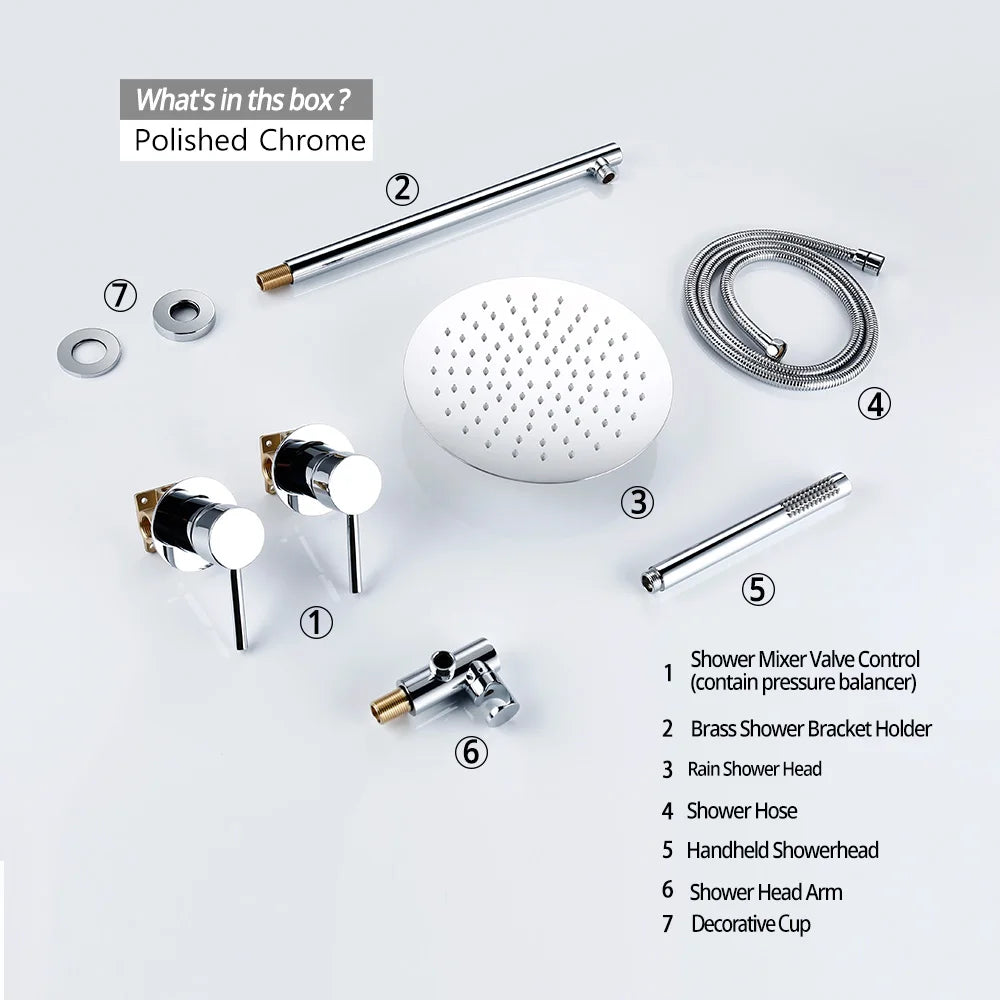 - Included: Shower mixer valve control (with pressure balancer), brass bracket holder, rainfall shower head, handheld shower head, shower hose, shower head arm, decorative cup.